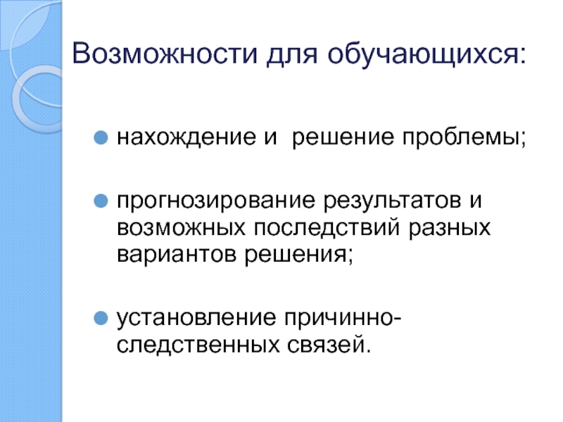 Возможности для обучающихся:нахождение и решение проблемы;прогнозирование результатов и возможных последствий разных вариантов решения;установление причинно-следственных связей.