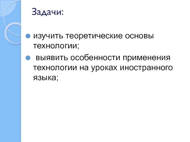 Задачи: изучить теоретические основы технологии; выявить особенности применения технологии на уроках иностранного языка;