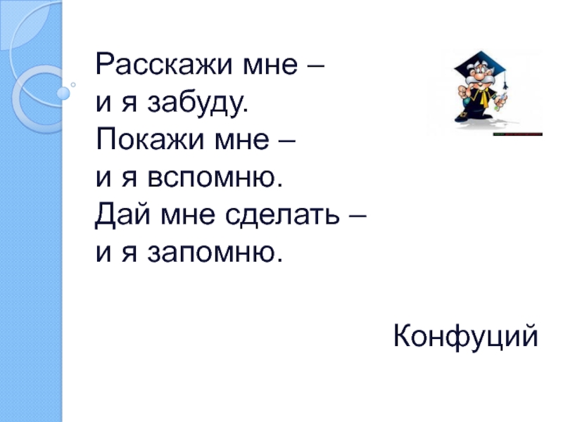 Слайд 11Расскажи мне – и я забуду. Покажи мне – и я
