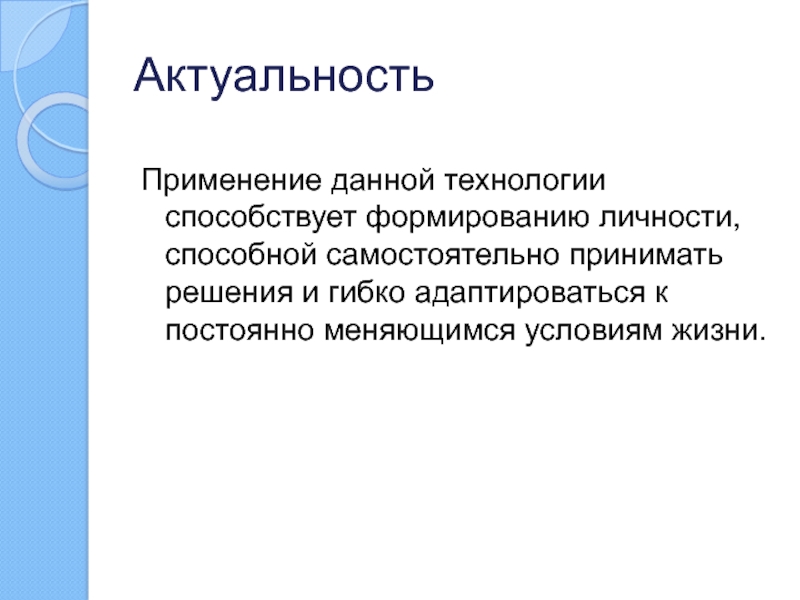 АктуальностьПрименение данной технологии способствует формированию личности, способной самостоятельно принимать решения и гибко адаптироваться к постоянно меняющимся условиям жизни.