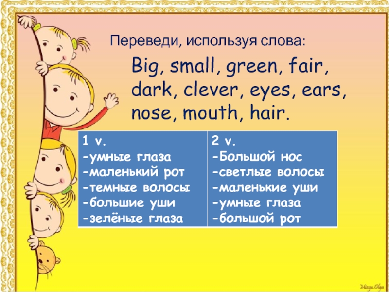 Переведи, используя слова:Big, small, green, fair, dark, clever, eyes, ears, nose, mouth, hair.