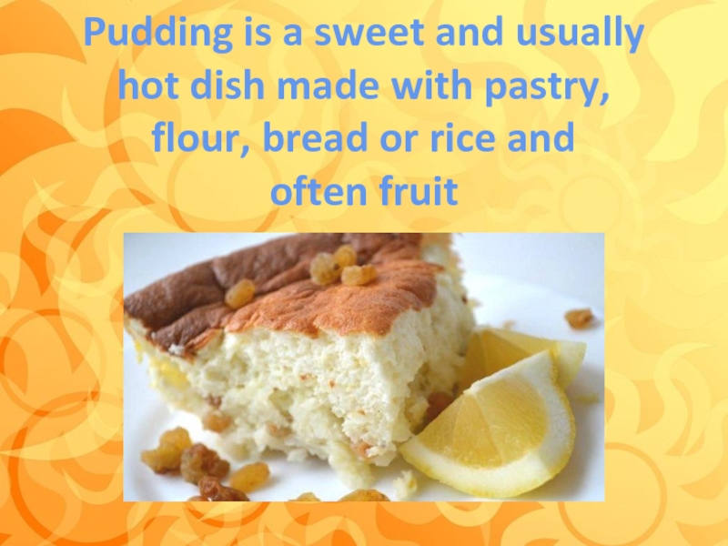Pudding is a sweet and usuallyhot dish made with pastry,flour, bread or rice and often fruit