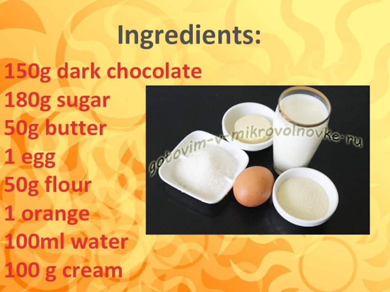 Ingredients:150g dark chocolate180g sugar50g butter1 egg50g flour1 orange100ml water100 g cream