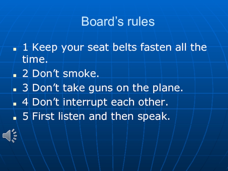 Board’s rules1 Keep your seat belts fasten all the time.2 Don’t smoke.3 Don’t take guns on the plane.4 Don’t interrupt each other.5 First listen and then speak.
