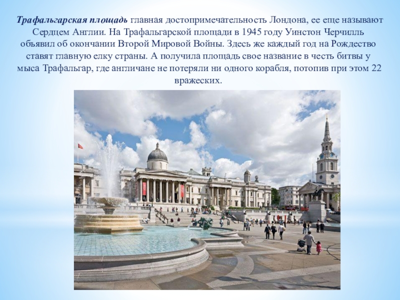 Слайд 27Трафальгарская площадь главная достопримечательность Лондона, ее еще называют Сердцем Англии. На