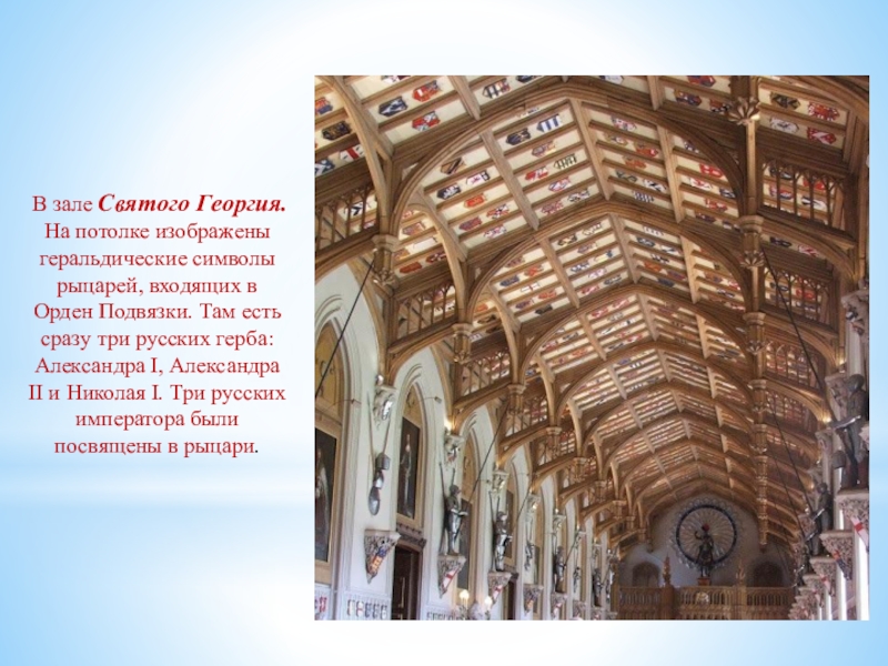 Слайд 36 В зале Святого Георгия. На потолке изображены геральдические символы рыцарей,