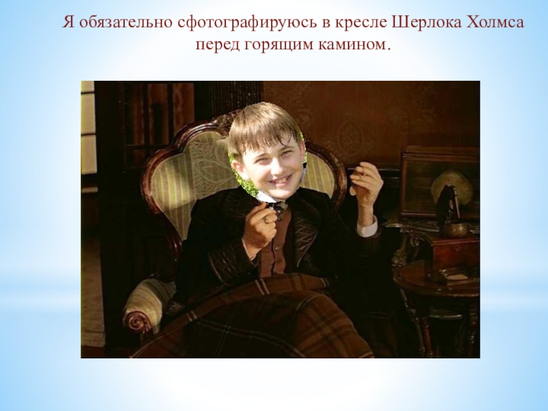 Слайд 21Я обязательно сфотографируюсь в кресле Шерлока Холмса перед горящим камином.