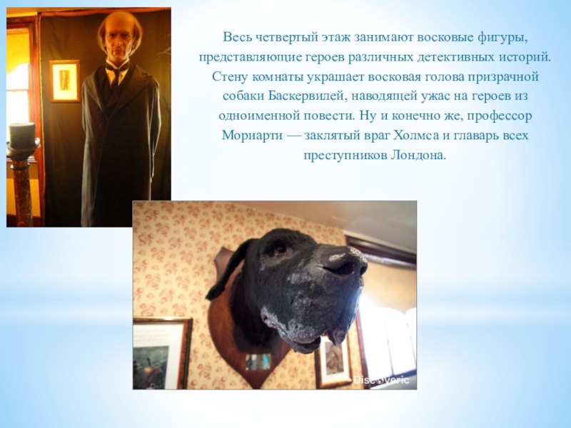 Стену комнаты украшает восковая голова призрачной собаки Баскервилей, наводящей ужас на героев из одноименной повести. Ну и конечно же, профессор Мориарти — заклятый враг Холмса и главарь всех преступников Лондона.