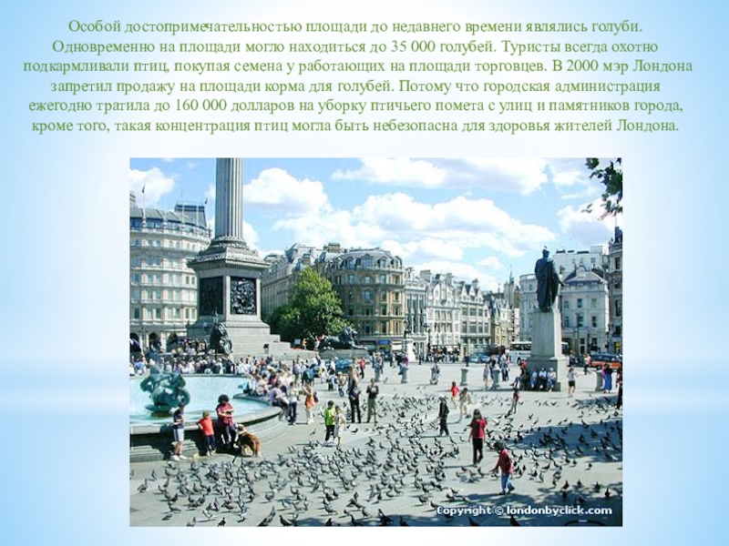 могло находиться до 35 000 голубей. Туристы всегда охотно подкармливали птиц, покупая семена у работающих на площади торговцев. В 2000 мэр Лондона запретил продажу на площади корма для голубей. Потому что городская администрация ежегодно тратила до 160 000 долларов на уборку птичьего помета с улиц и памятников города, кроме того, такая концентрация птиц могла быть небезопасна для здоровья жителей Лондона.