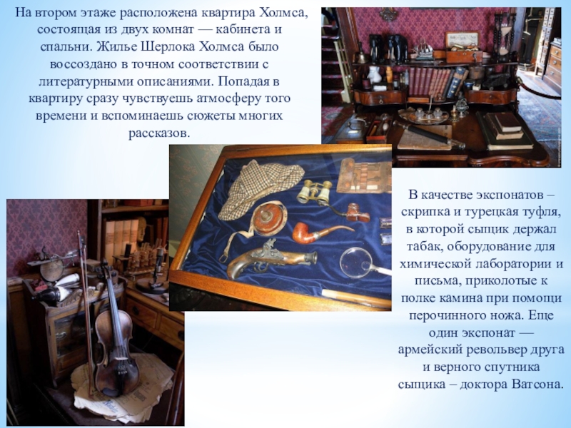 В качестве экспонатов – скрипка и турецкая туфля, в которой сыщик держал табак, оборудование для химической лаборатории и письма, приколотые к полке камина при помощи перочинного ножа. Еще один экспонат — армейский револьвер друга и верного спутника сыщика – доктора Ватсона.