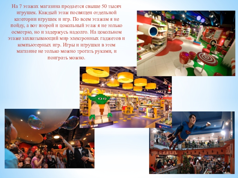 Слайд 31На 7 этажах магазина продается свыше 50 тысяч игрушек. Каждый этаж
