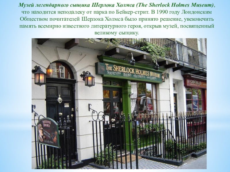 неподалеку от парка по Бейкер-стрит. В 1990 году Лондонским Обществом почитателей Шерлока Холмса было принято решение, увековечить память всемирно известного литературного героя, открыв музей, посвященный великому сыщику.