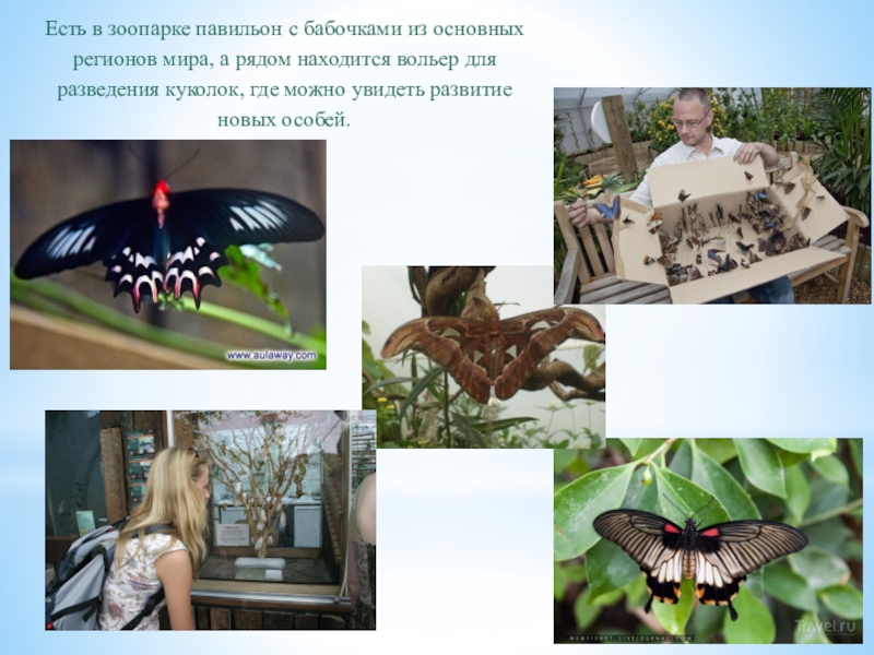 Слайд 25Есть в зоопарке павильон с бабочками из основных регионов мира, а