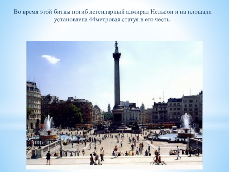 Слайд 28Во время этой битвы погиб легендарный адмирал Нельсон и на площади