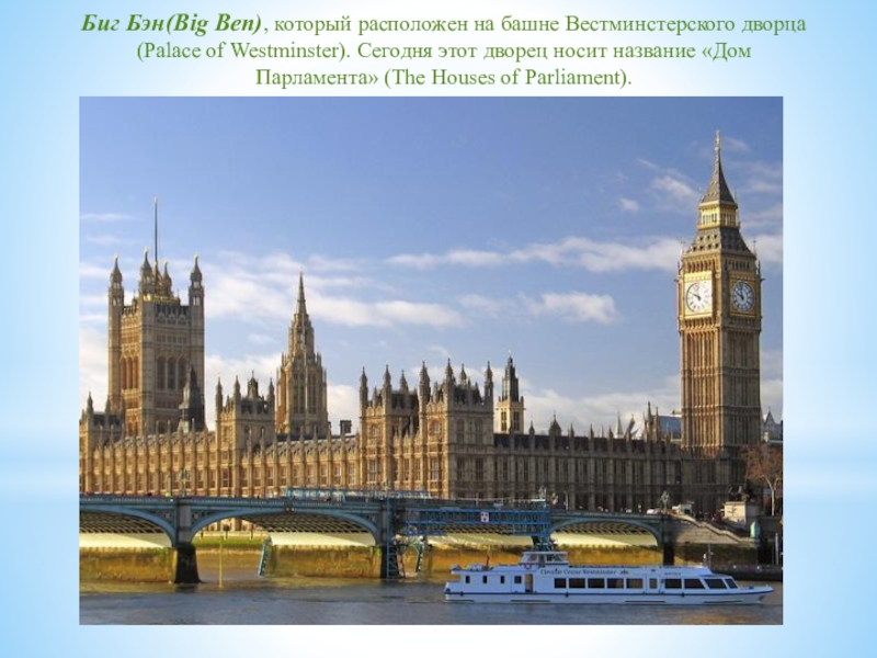 Слайд 15Биг Бэн(Big Ben), который расположен на башне Вестминстерского дворца (Palace of
