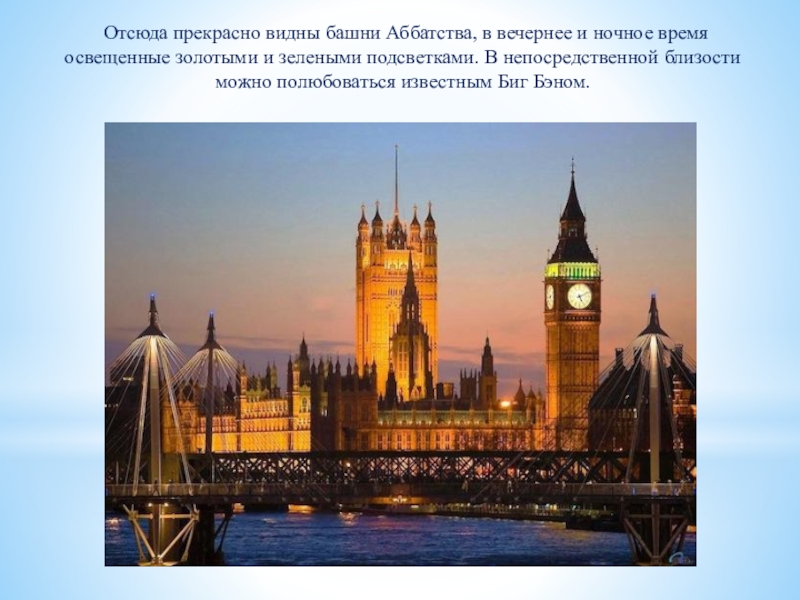 Слайд 18 Отсюда прекрасно видны башни Аббатства, в вечернее и ночное время