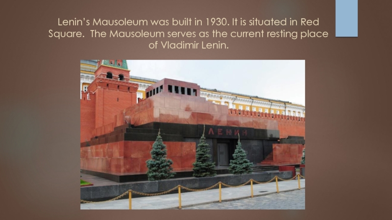 Слайд 7Lenin’s Mausoleum was built in 1930. It is situated in Red
