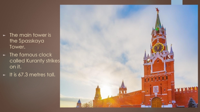 The main tower is the Spasskaya Tower. The famous clock called Kuranty strikes on it.It is 67.3