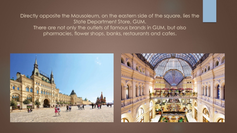 lies the State Department Store, GUM. There are not only the outlets of famous brands in GUM, but also pharmacies, flower shops, banks, restaurants and cafes.