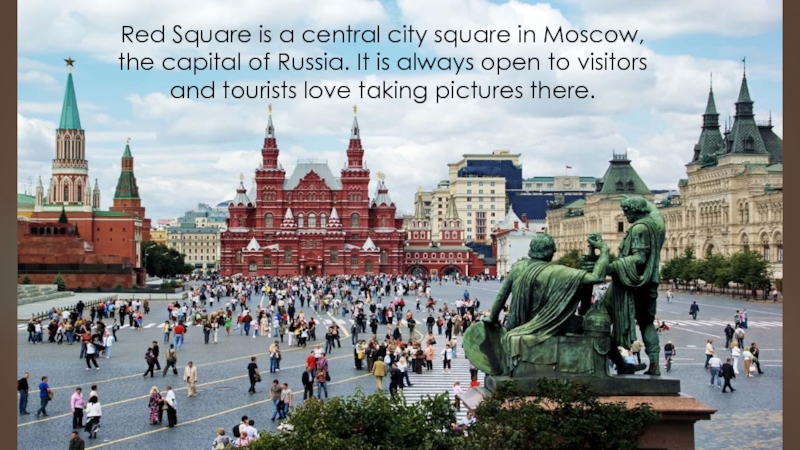 Red Square is a central city square in Moscow, the capital of Russia. It is always open to visitors and tourists love taking pictures there.