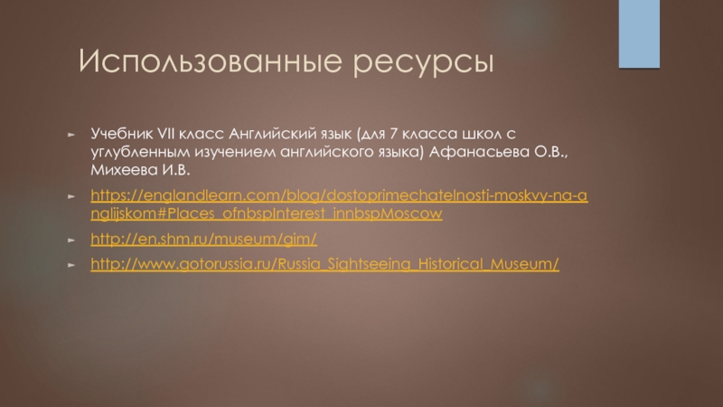 Использованные ресурсыУчебник VII класс Английский язык (для 7 класса школ с углубленным изучением английского языка) Афанасьева О.В., Михеева И.В. https://englandlearn.com/blog/dostoprimechatelnosti-moskvy-na-anglijskom#Places_ofnbspInterest_innbspMoscowhttp://en.shm.ru/museum/gim/http://www.gotorussia.ru/Russia_Sightseeing_Historical_Museum/