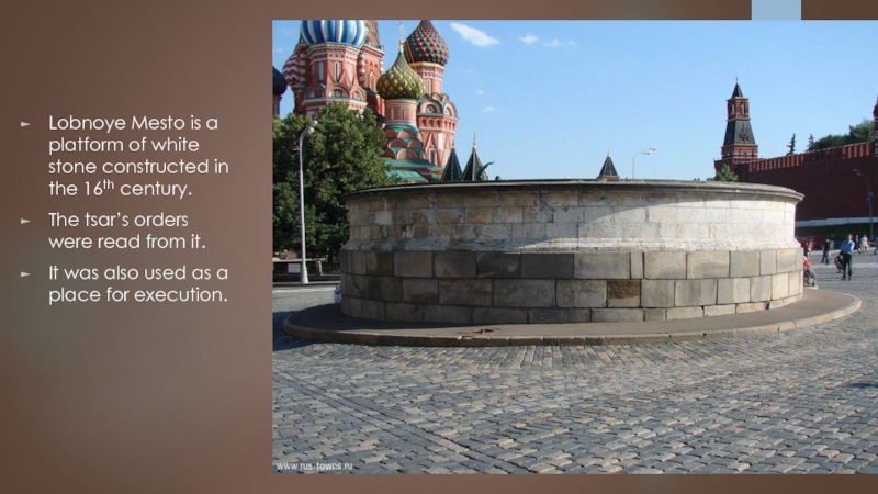 Слайд 5Lobnoye Mesto is a platform of white stone constructed in the