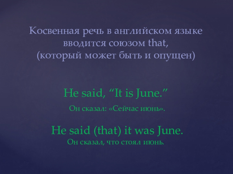 и опущен) He said, “It is June.” Он сказал: «Сейчас июнь». He said (that) it was June. Он сказал, что стоял июнь.