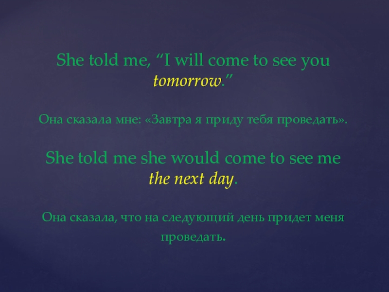 Слайд 5She told me, “I will come to see you tomorrow.” Она сказала