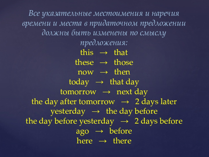 должны быть изменены по смыслу предложения: this → that these → those now → then today → that day tomorrow → next day the day after tomorrow → 2 days later yesterday → the day before the day before yesterday → 2 days before ago → before here → there