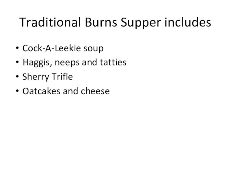 Traditional Burns Supper includesCock-A-Leekie soupHaggis, neeps and tattiesSherry TrifleOatcakes and cheese