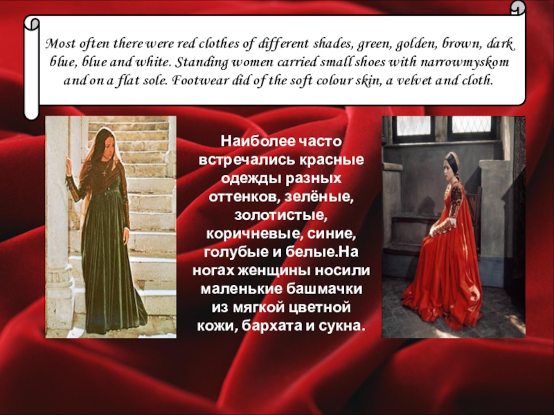 Наиболее часто встречались красные одежды разных оттенков, зелёные, золотистые, коричневые, синие, голубые и белые.На ногах женщины носили маленькие башмачки из мягкой цветной кожи, бархата и сукна.