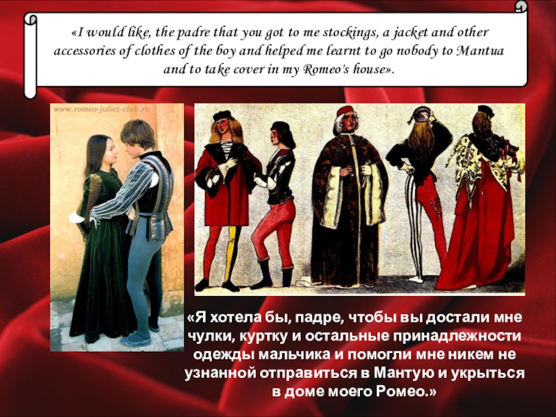 «Я хотела бы, падре, чтобы вы достали мне чулки, куртку и остальные принадлежности одежды мальчика и помогли мне никем не узнанной отправиться в Мантую и укрыться в доме моего Ромео.»