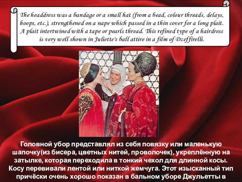 Головной убор представлял из себя повязку или маленькую шапочку(из бисера, цветных нитей, проволочек), укреплённую на затылке, которая переходила в тонкий чехол для длинной косы. Косу перевивали лентой или ниткой жемчуга. Этот изысканный тип причёски очень хорошо показан в бальном уборе Джульетты в фильме Дзеффирелли.