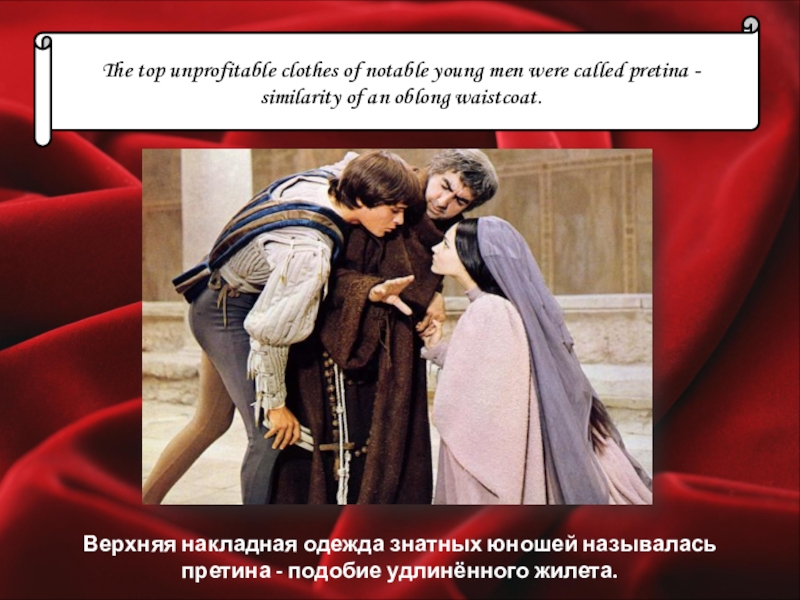 Верхняя накладная одежда знатных юношей называлась претина - подобие удлинённого жилета.