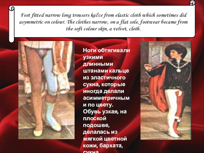 Ноги обтягивали узкими длинными штанами кальце из эластичного сукна, которые иногда делали асимметричными по цвету. Обувь узкая, на плоской подошве,делалась из мягкой цветной кожи, бархата, сукна.