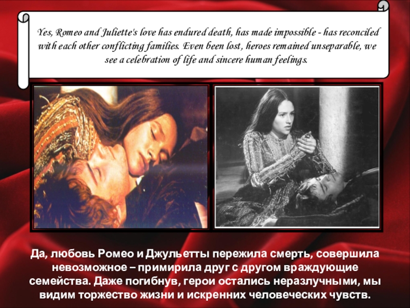 Да, любовь Ромео и Джульетты пережила смерть, совершила невозможное – примирила друг с другом враждующие семейства. Даже погибнув, герои остались неразлучными, мы видим торжество жизни и искренних человеческих чувств.