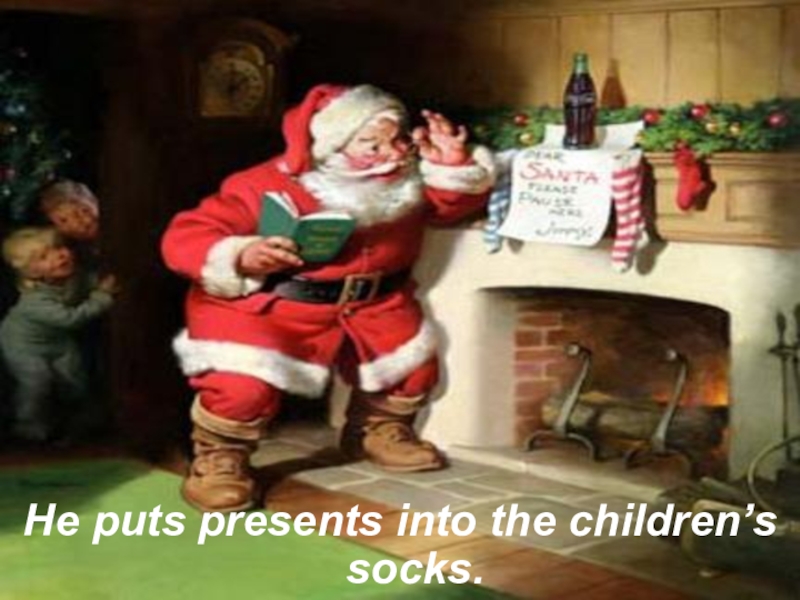 He puts presents into the children’s socks.