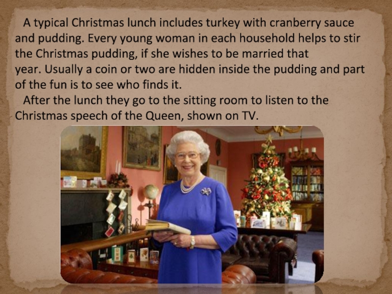 Слайд 9A typical Christmas lunch includes turkey with cranberry sauce and pudding.