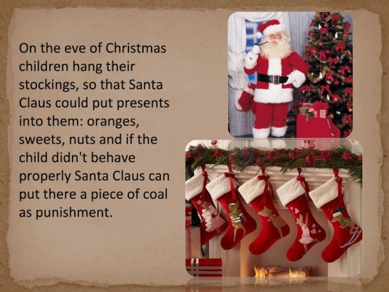 Слайд 6On the eve of Christmas children hang their stockings, so that