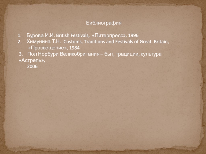 БиблиографияБурова И.И. British Festivals, «Питерпресс», 1996Химунина Т.Н. Customs, Traditions and Festivals of Great Britain,