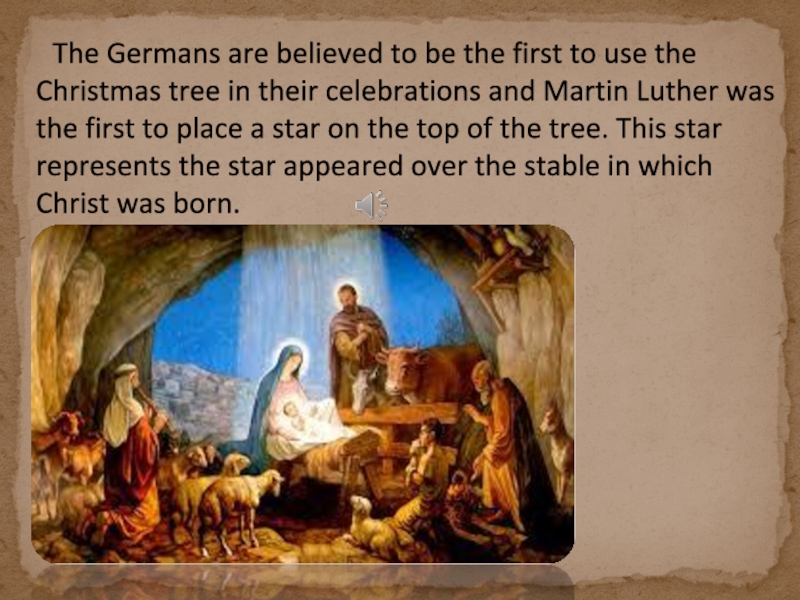 Christmas tree in their celebrations and Martin Luther was the first to place a star on the top of the tree. This star represents the star appeared over the stable in which Christ was born.