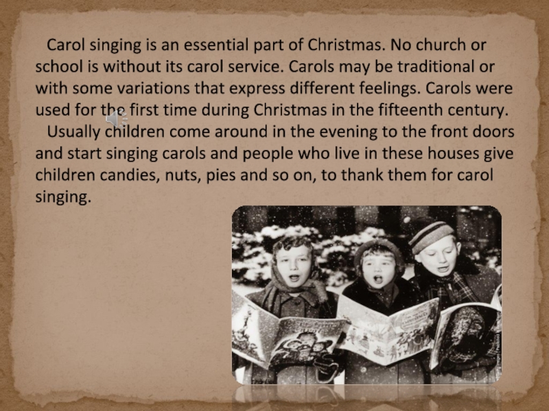 Слайд 8Carol singing is an essential part of Christmas. No church or