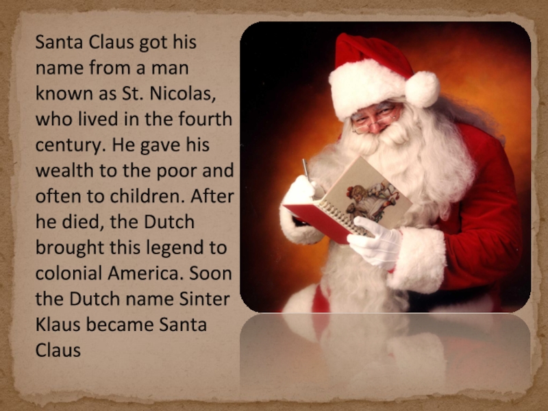 Nicolas, who lived in the fourth century. He gave his wealth to the poor and often to children. After he died, the Dutch brought this legend to colonial America. Soon the Dutch name Sinter Klaus became Santa Claus