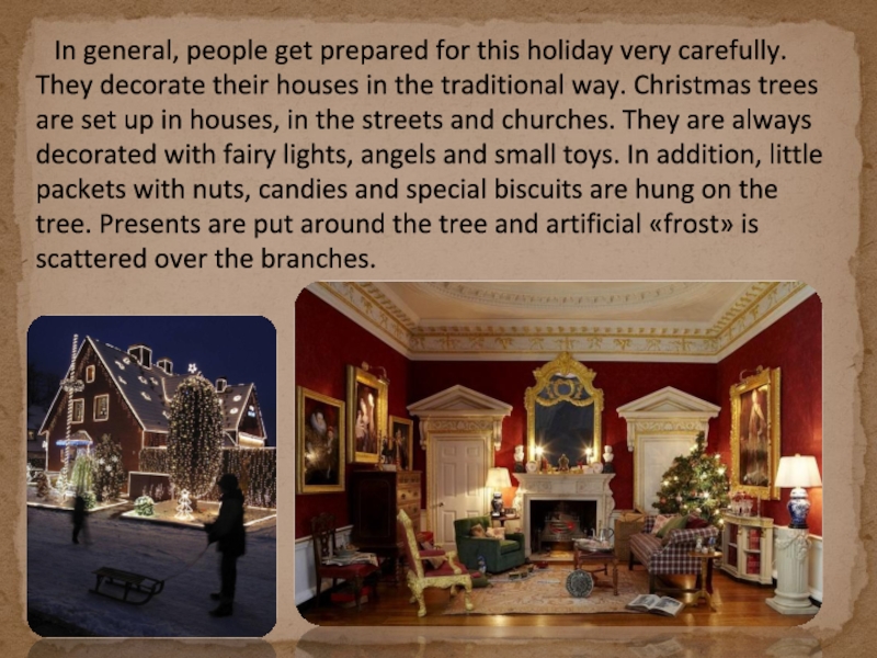 decorate their houses in the traditional way. Christmas trees are set up in houses, in the streets and churches. They are always decorated with fairy lights, angels and small toys. In addition, little packets with nuts, candies and special biscuits are hung on the tree. Presents are put around the tree and artificial «frost» is scattered over the branches.