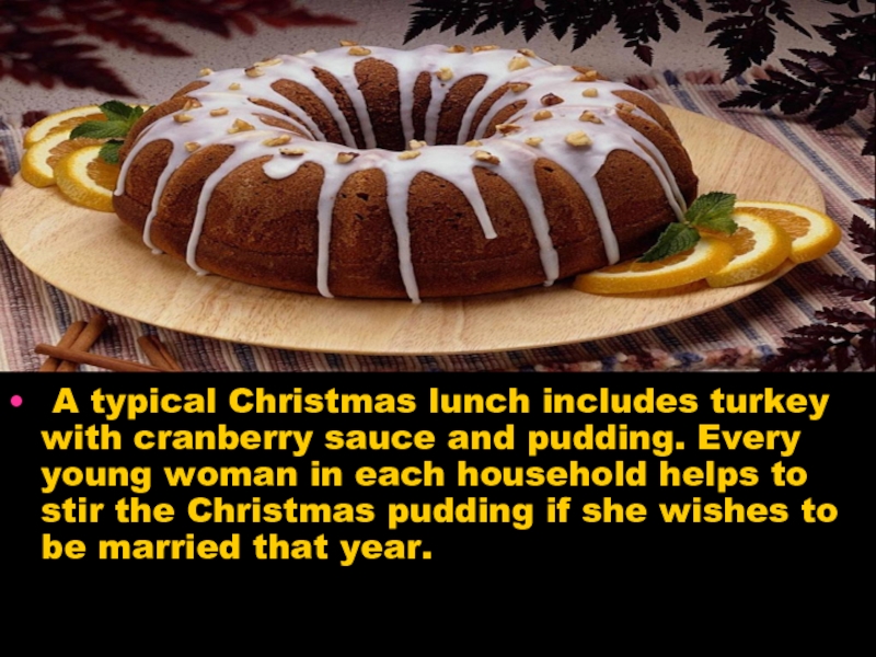Слайд 7 A typical Christmas lunch includes turkey with cranberry sauce and
