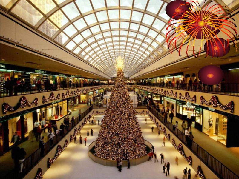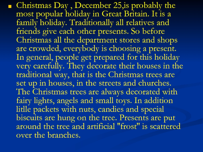 Great Britain. It is a family holiday. Traditionally all relatives and friends give each other presents. So before Christmas all the department stores and shops are crowded, everybody is choosing a present. In general, people get prepared for this holiday very carefully. They decorate their houses in the traditional way, that is the Christmas trees are set up in houses, in the streets and churches. The Christmas trees are always decorated with fairy lights, angels and small toys. In addition litlle packets with nuts, candies and special biscuits are hung on the tree. Presents are put around the tree and artificial ''frost'' is scattered over the branches.