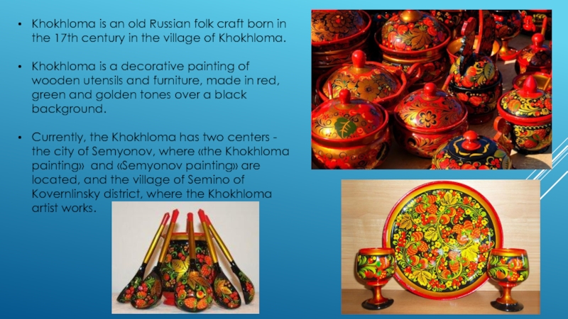 Слайд 4Khokhloma is an old Russian folk craft born in the 17th
