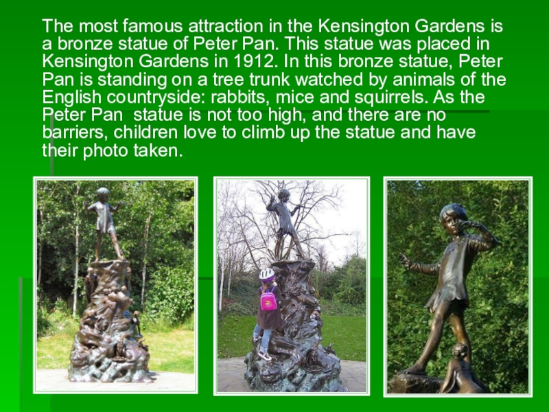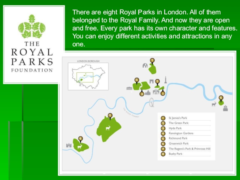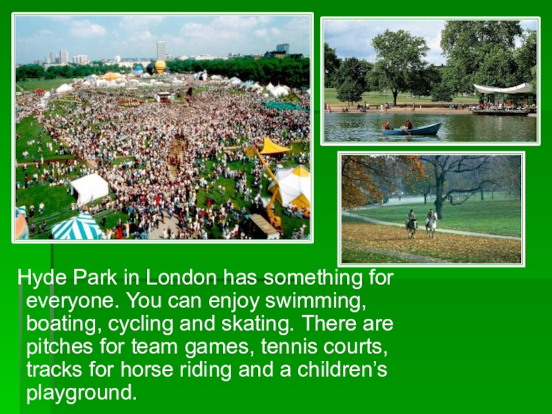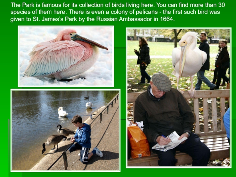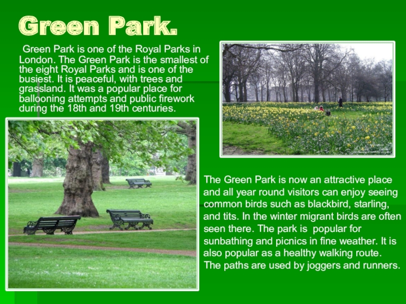The Green Park is now an attractive place and all year round visitors can enjoy seeing common birds such as blackbird, starling, and tits. In the winter migrant birds are often seen there. The park is popular for sunbathing and picnics in fine weather. It is also popular as a healthy walking route. The paths are used by joggers and runners.