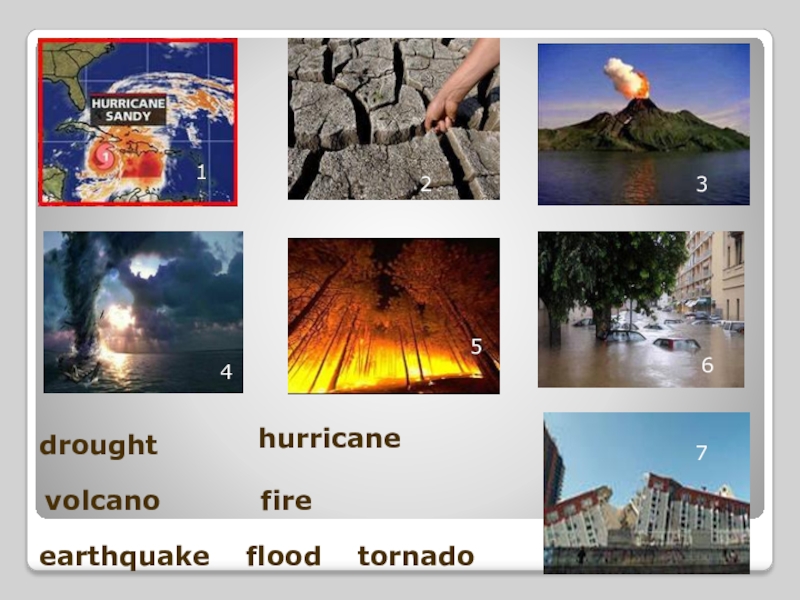 earthquake  flood  tornadodroughthurricanevolcano      fire    1234567