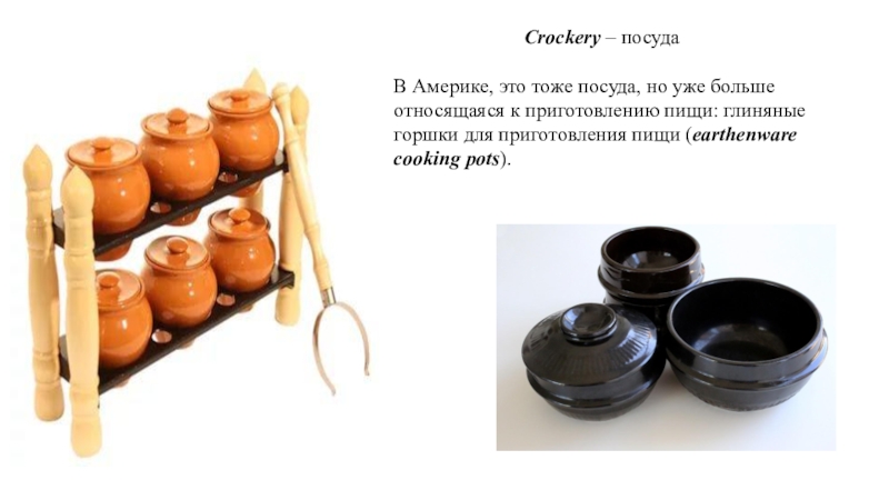 Crockery – посудаВ Америке, это тоже посуда, но уже больше относящаяся к приготовлению пищи: глиняные горшки для приготовления
